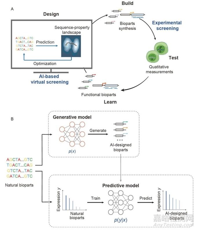 圖9 A, 生物部件設(shè)計(jì)的設(shè)計(jì)與構(gòu)建-測(cè)試-學(xué)習(xí)(DBTL)流程示意圖。生物部件設(shè)計(jì)將AI引導(dǎo)的虛擬篩選、生物部件合成、生物測(cè)量和功能特征學(xué)習(xí)整合到一個(gè)閉環(huán)框架中。B, 關(guān)于生成模型和預(yù)測(cè)模型的框架。