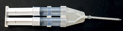 兩個針筒中的液態(tài)組分通過Y字型器械混合在一起,通過thio-Michael addition reaction迅速凝固成膠。
