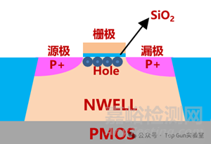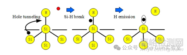 NBTI失效機(jī)理通俗的解釋:當(dāng)PMOS的柵極處于負(fù)偏壓下,PMOS的Si/SiO2界面處會(huì)形成大量的Si-H鍵,在垂直電場(chǎng)作用下,產(chǎn)生的空穴和Si-H進(jìn)行反應(yīng),使氫原子脫離,形成H、H-或者H2。