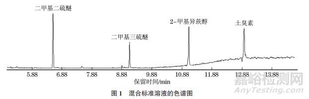 在GB/T 5750.3—2023《生活飲用水標準檢驗方法 第3部分:水質(zhì)分析質(zhì)量控制》中,使用 Elite- 624毛細管色譜柱分析二甲基二硫醚和二甲基三硫醚,使用HP-5毛細管色譜柱分析土臭素和2-甲基異莰醇。試驗考察了Elite-5MS和DB-624色譜柱對檢出限的影響,結(jié)果表明:Elite-5MS色譜柱對二甲基二硫醚和二甲基三硫醚的檢測受限,檢出限為20ng·L−1;DB-624色譜柱對4種嗅味物質(zhì)的響應(yīng)均能滿足國家標準 GB 5749-2022《生活飲用水衛(wèi)生標準》對檢出限的要求。因此,試驗選擇 DB-624色譜柱。
