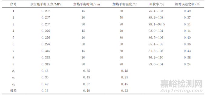 由表2可知,各因素對待測物回收率的影響程度按從大到小的順序排列為加熱平衡溫度、頂空瓶平衡壓力、加熱平衡時間。試驗選擇的頂空瓶平衡壓力為0.276MPa,加熱平衡時間為15min,加熱平衡溫度為70℃。