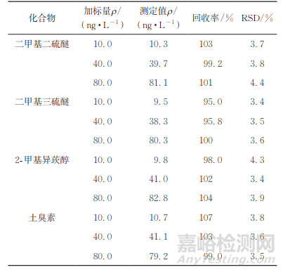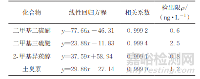 由表2可知:4種嗅味物質(zhì)標準曲線的相關(guān)系數(shù)均不小于0.9990;各嗅味物質(zhì)的檢出限均達到GB 5749— 2022的要求。