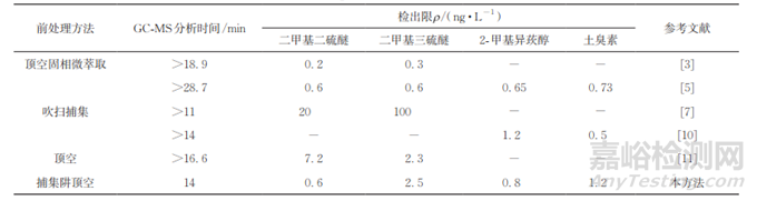 4種嗅味物質(zhì)在污染的水體中以 ng·L−1級存在,選擇合適的前處理方法進行富集萃取,是精確定量檢測的關(guān)鍵。針對嗅味物質(zhì)的前處理,美國國家環(huán)境保護署(USEPA)發(fā)布的 TO-15的前處理方法是多級冷阱預(yù)濃縮方法,我國前處理方法主要有吸附法、冷阱法、頂空法、吸收液吸收法。國家標準GB/T 5750— 2023和相關(guān)文獻中,土臭素和2-甲基異莰醇的前處理方法為頂空固相微萃取法;二甲基二硫醚和二甲基三硫醚的前處理方法為吹掃捕集法。這幾種方法均有各自的不足之處。