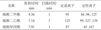 離子源:電子轟擊離子源(EI);電壓:負(fù)70 eV;傳輸線溫度:250 °C;離子源溫度:280 °C;采集方式:定時選擇性離子監(jiān)測(T-SIM);采集時間:±1 min;3種硫酸酯特征離子和質(zhì)譜參數(shù)見表1。