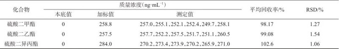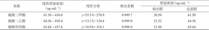 表2 3種硫酸酯的線性范圍、線性方程、相關(guān)系數(shù)、檢出限和定量限