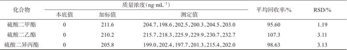 由表2可知,3種硫酸酯的質(zhì)量濃度在各自范圍內(nèi)與質(zhì)譜峰面積具有良好的線性關(guān)系,線性相關(guān)系數(shù)均大于0.995,表明該方法檢出限和定量限均滿足檢測要求,靈敏度較高。