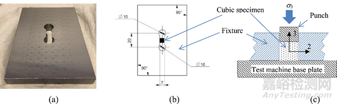 圖 3. (a) 鋼制夾具,(b) 夾具俯視圖,包括試件,(c) 夾具裝置的橫截面圖,其中樣本中的纖維方向與頁面垂直