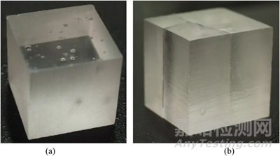 圖 6. 立方玻璃試樣 (a) 測試前 (選擇一個(gè)透明的表面以顯示內(nèi)部氣泡) (b) 失效后的試件 (壓縮載荷加在垂直方向上)