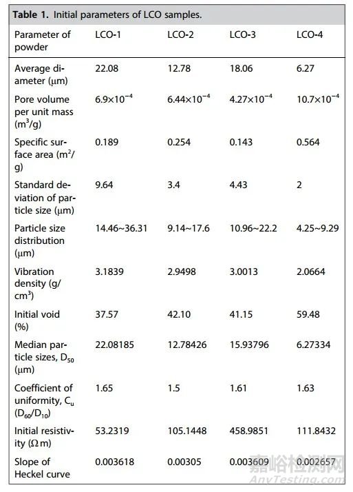 表1.四種LCO粉末的初始理化性質