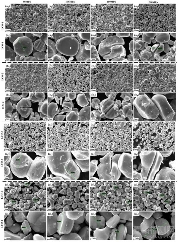 圖2a-d分別為50、100、150、200 MPa下LCO粉末的整體和局部SEM圖像。粉體粒度分布的差異直接影響粉體在壓縮過程中的填充效率、壓實密度和電化學性能。與其他試樣相比,平均粒徑最小的LCO-4試樣在相同壓力下顆粒變形較小,不易破碎。可以看出,LCO粉末在一定的力作用下會發(fā)生剪切斷裂。當任意平面上的剪應力等于LCO的抗剪強度時,表面發(fā)生開裂。在剪切斷裂過程中,出現(xiàn)一組傾斜的拉伸裂紋,隨著應力的增大,拉伸裂紋相互貫通,形成貫通的剪切面,最終導致顆粒最終的剪切斷裂。值得注意的是,斷裂只對由一次顆粒組成的二次顆粒有效。