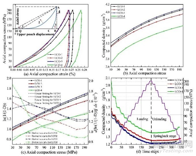 其中σ為軸向壓實應力,D為對應壓力下粉末的相對密度。k和A分別為擬合直線的斜率和截距,分別代表粉末塑性程度和變形前狀態(tài)。k值越大,表明同樣的應力變化引起的密度變化越大,粉末的塑性越大。實驗表明,當k一定時,表明粉末的相對密度變化是由塑性變形引起的。若k為變量,則擬合函數為曲線,說明相對密度的變化是由重排、斷裂等因素引起的。圖3c繪制了LCO樣品的Heckel曲線、擬合直線和微分曲線。k值順序為LCO-4>LCO-1>LCO-3> LCO-2,即在相同壓力下,LCO-4樣品的平均直徑最小,變形量最大。綜合對比下,LCO-2試樣的塑性最小。圖3d記錄了壓實過程中粉末厚度和應力隨時間變化的數據。隨著載荷的增加,粉末內部應力逐漸增大,而變形逐漸減小并接近壓實厚度。LCO-4的塑性形變最大,其他樣品具有相似的彈性和塑性性能。