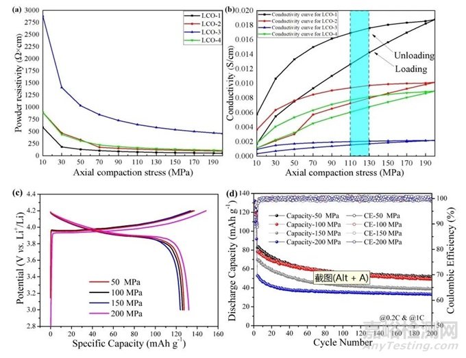 采用元能科技的粉末電阻率&壓實密度儀(PRCD3100),對LCO粉末的力學性能和電化學性能進行了研究,實時測試了LCO粉末的應力應變、壓實密度和電阻率曲線。在一定程度上,平均直徑越小,壓實過程中軸向變形越大,電阻率越高,壓實密度越大。這是因為直徑越小,比表面積越大,孔隙率越小,無法為機械變形提供足夠的空隙。不同壓實后LCO的電化學性能主要受粉末的形貌差異、接觸面積和電導率的影響,說明顆粒集成的LCO電極壓實越小,電池性能越好。