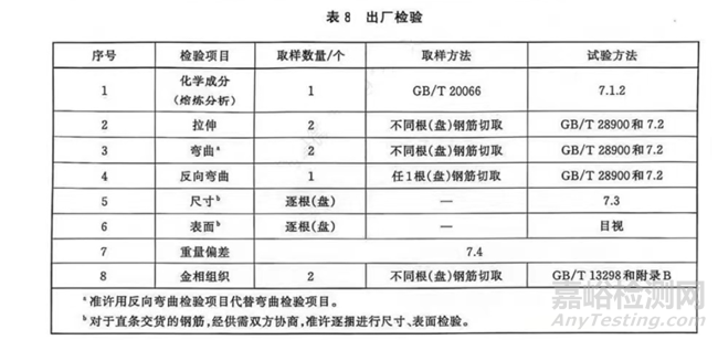 每批鋼筋的檢驗項目、取樣數(shù)量、取樣方法和試驗方法應符合表8的規(guī)定。
