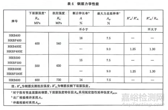 鋼筋的下屈服強度ReL、抗拉強度Rm、斷后伸長率A、最大力總延伸率Agt等力學性能特征值應符合表6的規(guī)定。表6所列各力學性能特征值,其中圖片為最大保證值,其他為最小保證值。