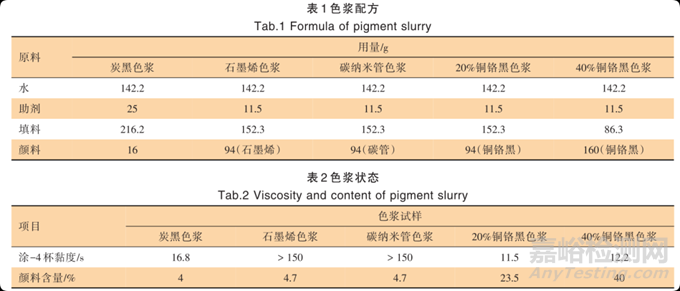 按照表 1 所述比例,把原料依次加入罐中高速分散,用刮板細(xì)度計(jì)跟蹤顏料分散狀況直至色漿粒徑約20 μm。由于碳納米管和石墨烯對(duì)涂料黏度影響很大,碳納米管色漿和石墨烯色漿的制備均采用了先研磨分散填料,后加入顏料繼續(xù)分散的方式進(jìn)行。各色漿的涂-4杯黏度如表2所示,石墨烯和碳納米管比表面積大,吸油量高,盡管實(shí)際加入質(zhì)量?jī)H占色漿總質(zhì)量的 4.7%,石墨烯色漿和碳納米管色漿黏度均超過(guò)150 s,基本失去流動(dòng)性;20%、40%銅鉻黑色漿黏度較為合適且有繼續(xù)提高顏料用量的空間。