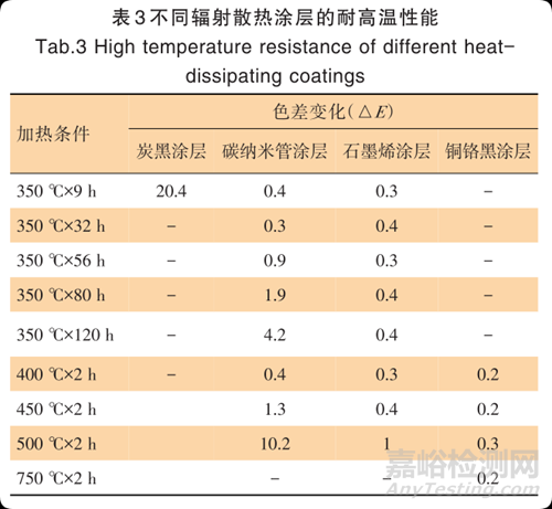 一般情況下,輻射散熱涂料工作溫度都相對(duì)較高,為此首先考察了不同涂層的熱穩(wěn)定性。從表 3 可以看出,炭黑涂層在 350 ℃馬弗爐中放置 9 h,涂層褪色嚴(yán)重,色差變化高達(dá) 20.4。實(shí)際上,在耐高溫的黑色顏料中,炭黑涂層只適合 250 ℃以下的長(zhǎng)期耐熱。碳納米管涂層的耐熱性優(yōu)于炭黑,在 350 ℃條件下放置 80 h, 色差變化為 1.9。但是,它在 500 ℃條件下迅速褪色。因此,可以估計(jì)該碳納米管涂層僅適合于300 ℃以下的長(zhǎng)期使用。