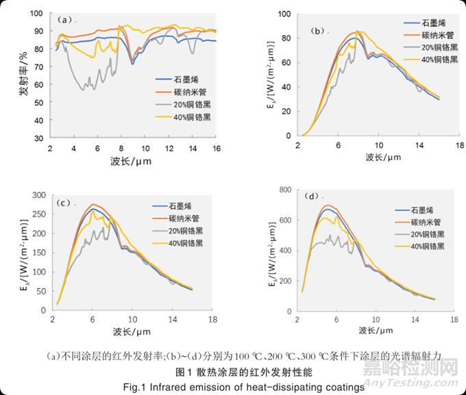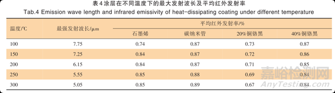 如表 4 所示,在100 ℃條件下,石墨烯涂層和20%銅鉻黑涂層的平均發(fā)射率基本相同。隨著涂層溫度的升高,20%銅鉻黑的紅外發(fā)射率相比其他涂層明顯低,意味著此時(shí)它通過(guò)熱輻射的形式把物體表面熱量散發(fā)出去的能力下降。在 150~300 ℃范圍內(nèi),石墨烯涂層與 40%的銅鉻黑的平均紅外發(fā)射率大小相當(dāng),均略低于碳納米管涂層。