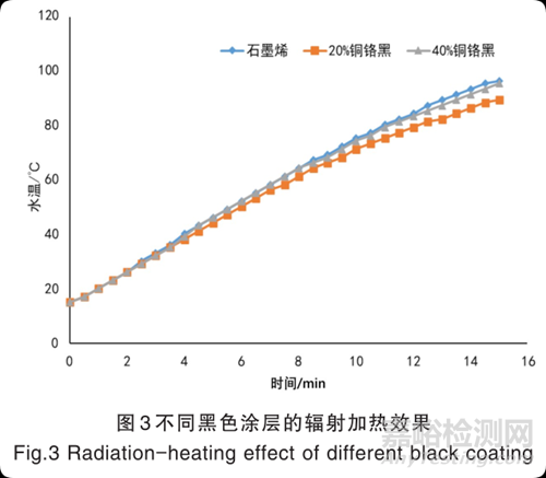 輻射散熱涂層通過(guò)熱輻射、空氣對(duì)流、熱傳導(dǎo)把熱源供給的熱量散發(fā)出去,當(dāng)體系處于平衡狀態(tài)時(shí),散發(fā)的熱量等于熱源供給的熱量。為研究不同輻射散熱涂層用于直接加熱的效率差異,搭建了實(shí)驗(yàn)裝置:在電子萬(wàn)用爐(功率 0.41 kW)上放置噴涂不同輻射散熱涂層的不銹鋼板,打開(kāi)電爐,待不銹鋼板溫度穩(wěn)(此時(shí)板溫),在不銹鋼板上方5 cm 處,放置一盛水錐形瓶,實(shí)時(shí)監(jiān)測(cè)錐形瓶中水溫變化。如圖 3 所示,在 20%銅鉻黑涂層上面,水溫從 15 ℃升至 89 ℃;而在40%銅鉻黑涂層和石墨烯涂層上面,水溫分別溫至 95 ℃和 96 ℃。與空氣對(duì)流傳熱和熱傳導(dǎo)不同,輻射能無(wú)需空氣作為介質(zhì),在熱源和被加熱物體之間按照光速進(jìn)行直線傳播,具有方向性,具有較高紅外發(fā)射率的輻射散熱涂層可以更有效地把熱量傳遞給被加熱物體。仔細(xì)對(duì)比上述試驗(yàn)中水溫的上升速度,可以發(fā)現(xiàn),與各涂層的紅外發(fā)射率并不是簡(jiǎn)單的正比關(guān)系。用熱偶電極測(cè)試了平衡狀態(tài)下的涂層溫度:20%銅鉻黑涂層279 ℃,石墨烯涂層為270 ℃,40%銅鉻黑涂層為 271 ℃。在有穩(wěn)定熱源供給能量的情況下,紅外發(fā)射率低的涂層通過(guò)自身溫度的提高來(lái)增加空氣對(duì)流和輻射散熱的能力以達(dá)到熱平衡,這也說(shuō)明對(duì)于具有穩(wěn)定熱量供給的發(fā)射體,表面涂覆一層紅外發(fā)射率較高的涂層,可以起到降低其正常工作時(shí)表面溫度的作用。