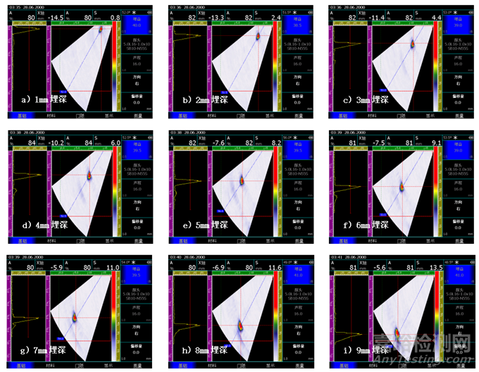 圖7 1mm~9mm埋深下φ0.2mm模擬隧道缺陷的超聲相控陣檢測結果