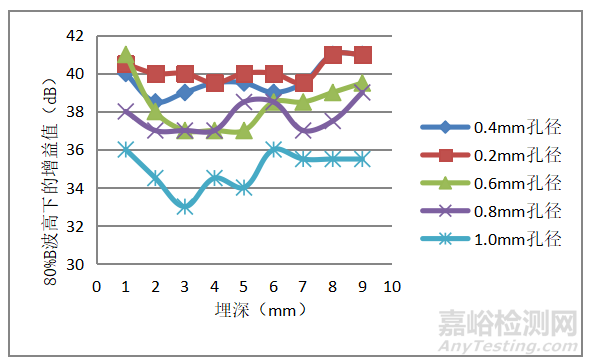 分別對不同孔徑、不同埋深的隧道模擬缺陷和不同板厚、不同長度及深度的未焊透模擬缺陷進行了檢測,所有預制的人工缺陷均能夠被有效的檢測出來。圖7所示為1mm 到9mm埋深下直徑0.2mm隧道模擬缺陷的超聲相控陣檢測圖譜,從中可以看出,超聲相控陣檢測對不同埋深下 0.2mm的隧道模擬缺陷都具有非常高的信噪比,完全可以滿足實際檢測需求。圖8所示為不同孔徑、不同埋深下的隧道模擬缺陷在80%回波高度下的增益對比,從圖中可以看出,隨著隧道孔徑的增大,檢測所需的增益值呈下降趨勢。圖中的個別數(shù)據(jù)波動分析為手工檢測時的測量誤差所致。