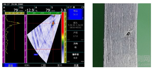 圖12 3.6mm摩擦焊試板中約1mm深0.5mm直徑的隧道缺陷超聲相控陣檢測結果及缺陷實際形貌圖