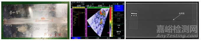圖14 1.6mm試板中未焊透缺陷的超聲相控陣與X射線檢測結果比對