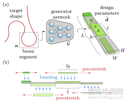 該研究提出了一種基于生成對抗網(wǎng)絡(luò)(GAN)的逆設(shè)計方法,用于構(gòu)建能夠變形為目標(biāo)形狀并執(zhí)行復(fù)雜預(yù)定運動的軟復(fù)合材料梁。該方法利用了具有被動層和主動層的復(fù)合材料,這些層由于非均勻的幾何和材料屬性,通過溫度驅(qū)動應(yīng)變失配達到預(yù)定變形的目的。