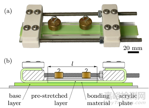 圖3 展示了用于制造變形軟復(fù)合材料梁的裝置。(a) 該裝置由 3D 打印部件、螺栓、螺母和螺紋桿組成,用于復(fù)合材料梁的制造階段。通過擰緊螺母,可以非常精確地控制單個層的拉伸。(b) 制造階段的橫截面視圖。