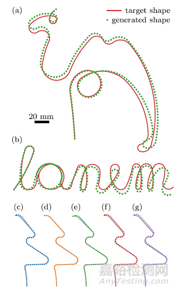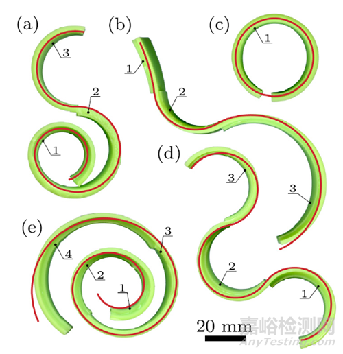 圖4 對比了目標(biāo)梁形狀(紅色曲線)和根據(jù)生成的設(shè)計參數(shù)制造的復(fù)合材料梁(綠色硅膠聚合物)。(a) 和 (b) 為由隨機訓(xùn)練示例組裝的形狀,(c) 為圓形,(d) 為波浪形,(e) 為螺旋形。圖中數(shù)字代表每個部分,指示用于制造每個復(fù)合材料梁的設(shè)計參數(shù)。