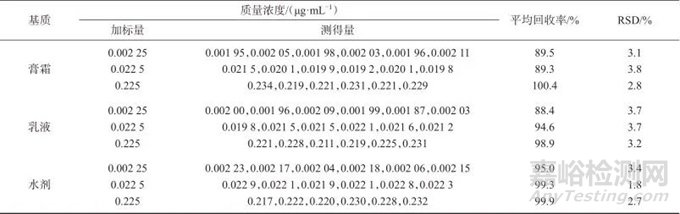3種基質的基質效應均不相同,且化妝品基質種類繁多、形式復雜,在實際測定中亦不可避免地存在基質效應,因此采用基質匹配標準溶液校正法進行后續(xù)測定。