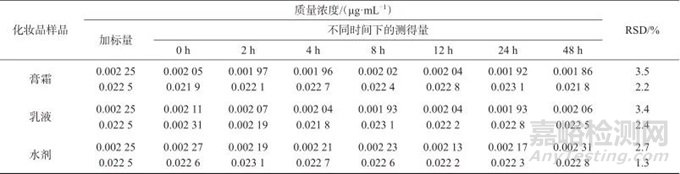 取0.002、0.02 μg/mL的空白基質加標樣品溶液于4℃下放置,分別在0、2、4、8、12、24、48 h進行測定,試驗結果見表5。