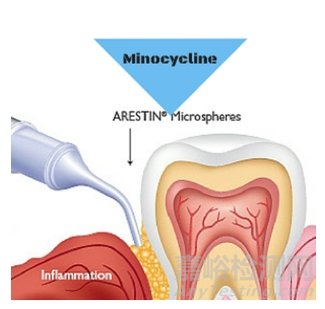 2001年2月,美國FDA批準(zhǔn)了OraPharma公司提交的鹽酸米諾環(huán)素緩釋微球(商品名:Arestin®)上市申請,用于輔助齦下刮治及根面平整術(shù)(scaling and root planing, SRP)治療成人牙周炎。