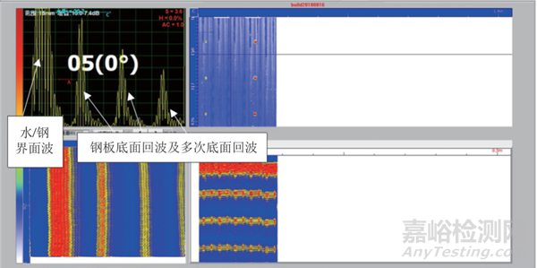 在檢測系統(tǒng)中以鋼板底面回波作為耦合監(jiān)視,確保檢測的有效性。在無缺陷區(qū)域,示波屏上顯示水/鋼界面波和鋼板底面回波及多次底面回波,該顯示由相控陣探頭的5號晶元0°角進行控制,耦合監(jiān)視波形如圖1所示。