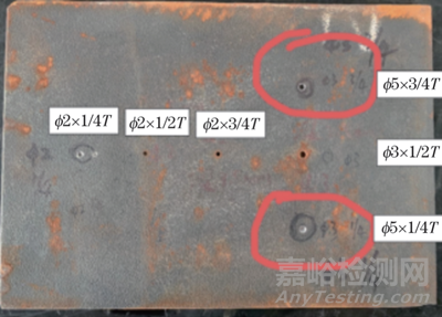 試件尺寸為250 mm×150 mm×7 mm,在試件中刻有6處平底孔人工缺陷,直徑分別為5,3,2 mm,深度分別為3/4T,2/4T,1/4T(T為鋼板厚度),即深度分別為5.25,3.50,1.75 mm,試驗二標(biāo)樣外觀如圖3所示。