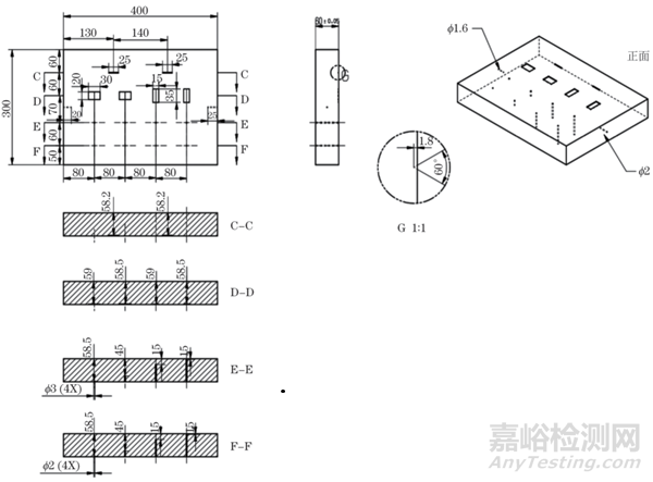 試件尺寸為300 mm×400 mm×60 mm,在試件中刻有φ2 mm的平底孔,深度分別1.5,15.0,45.0,58.5 mm,60° V形槽深度為58.2 mm,長度為15 mm以及直徑分別為1.2,2.0,1.6,2.0,3.0 mm的豎通孔,試驗三標(biāo)樣結(jié)構(gòu)示意如圖6所示(槽及平底孔尺寸公差均為±0.05 mm)。