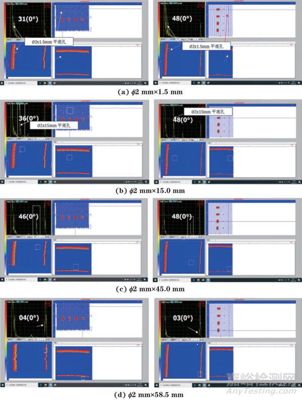 (2)對該試件中深度分別為1.5,15.0,45.0,58.5 mm的φ2 mm平底孔進行縱波檢測,不同頻率相控陣探頭的檢測波形如圖8所示。