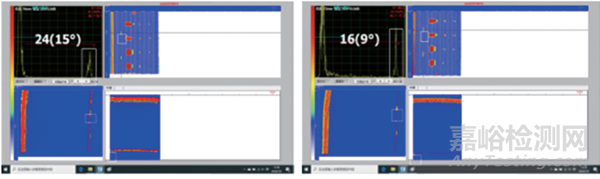 (3)對該試件中深度為58.2 mm,長為15 mm,角度60°的V形槽采用不同頻率的相控陣探頭進行橫波檢測,檢測波形如圖9所示,其中5 MHz探頭由24號晶元在15°角上檢測出(左圖),7.5 MHz探頭由16號晶元在9°角上檢測出(右圖)。