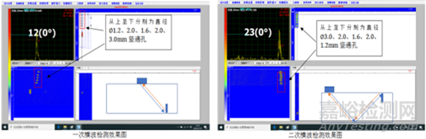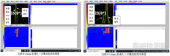 在橫波檢測區(qū)域,對于60° V形槽,φ1.2,2.0,1.6,2.0,3.0 mm豎通孔,均能檢測出,且鋼板邊部盲區(qū)不大于3 mm,分辨力不小于15 dB。