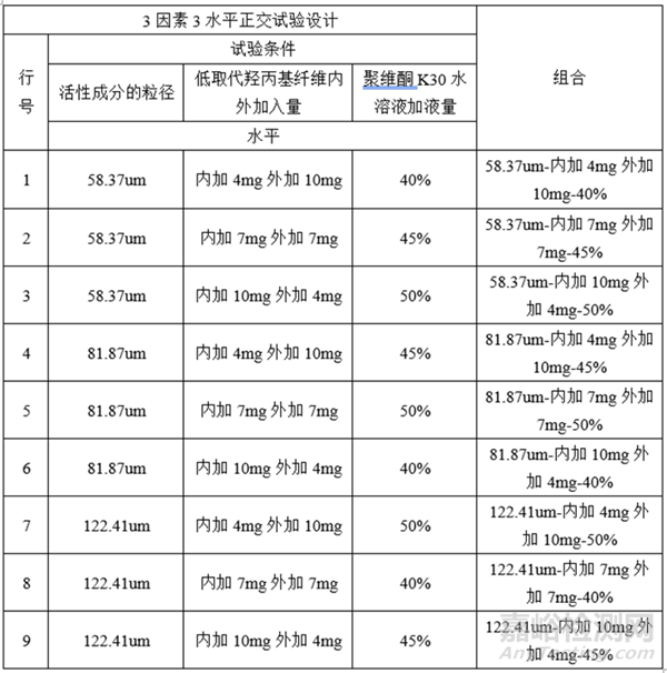 需要考察的參數(shù)有活性成分的粒徑范圍,崩解劑-低取代羥丙基纖維素內(nèi)外加入的具體量,黏合劑-聚維酮K30水溶液的加液量。采用科學(xué)的正交試驗(yàn)設(shè)計(jì),通過(guò)考察工藝的順暢性,溶出曲線的擬合性,從而篩選出活性成分的粒徑范圍,崩解劑-低取代羥丙基纖維素內(nèi)外加入的具體量,黏合劑-聚維酮K30水溶液的加液量。