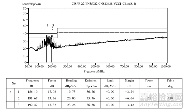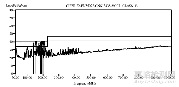 經(jīng)過初步定位, 去掉信號輸出電纜后輻射很低, 滿足CLASSB要求, 并有6dB以上的裕量?