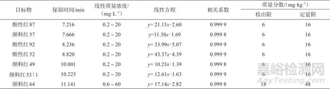 表2 7種著色劑的線性范圍、線性方程、相關(guān)系數(shù)、檢出限及定量限
