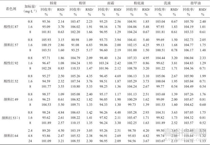 在唇膏、粉餅、面霜、粉底液、乳液和指甲油6種空白樣品中分別進(jìn)行3個水平添加,每個水平平行測定6次,計(jì)算加標(biāo)回收率和精密度,試驗(yàn)結(jié)果見表3。