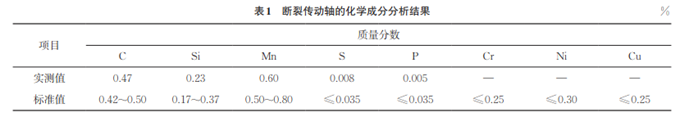 在斷裂傳動軸上取樣,對試樣進行化學成分分析,結果如表1所示。由表1可知:斷裂傳動軸的化學成分符合GB/T 699—2005 《優(yōu)質碳素結構鋼》對45鋼的要求。