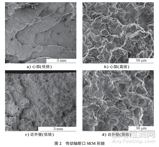 在傳動軸斷口處取樣,對試樣進行SEM分析,結果如圖2所示。由圖2可知:整個斷口呈河流花樣;斷口心部粗糙區(qū)域主要呈沿晶+少量準解理特征;裂紋擴展區(qū)存在較多的二次裂紋,沿中心至邊緣區(qū)域進行觀察,邊緣區(qū)域形貌與心部形貌基本一致;整個斷口以沿晶+ 準解理特征形貌為主,整個斷口呈氫脆斷口特征。