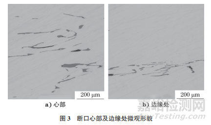 在斷口心部及邊緣處取樣,對試樣進行金相檢驗,結果如圖3所示。由圖3可知:試樣心部和邊緣區(qū)域均存在較多的非金屬夾雜物,夾雜物為硫化物,夾雜物附近可觀察到顯微裂紋。