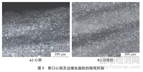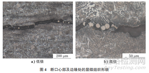 斷口心部及邊緣處的顯微組織形貌如圖4所示。由圖4可知:試樣心部組織為貝氏體,邊緣區(qū)域組織為貝氏體+ 回火索氏體。心部與邊緣晶粒度一致,按照GB/T 6394—2017 《金屬平均晶粒度的測定》評為8.0級;未發(fā)現(xiàn)心部存在過熱、過燒等異常組織,在心部區(qū)域存在較多的小裂紋(見圖5)。