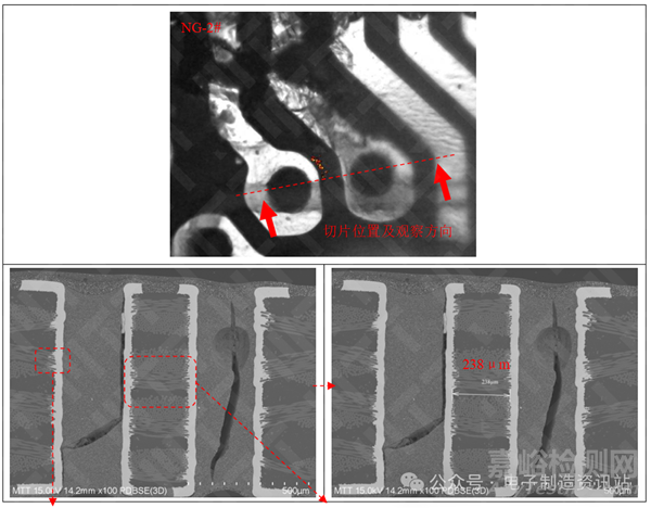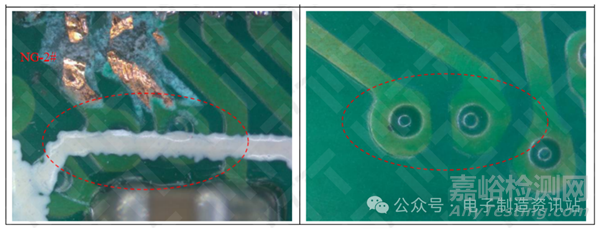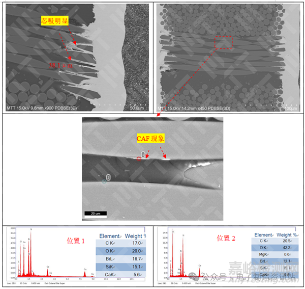 ①漏電通孔之間發(fā)現(xiàn)CAF(導(dǎo)電陽極絲)現(xiàn)象;