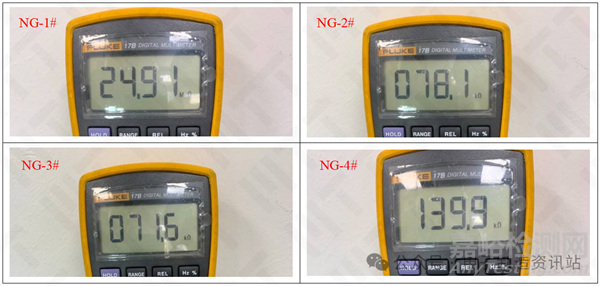 圖1.失效復(fù)現(xiàn)4pcs相鄰?fù)组g電阻測量照片