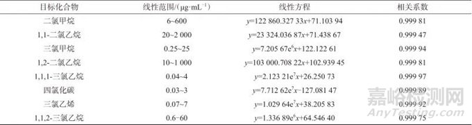 表1 8種氯代烴的質(zhì)量濃度線性范圍,線性方程和相關(guān)系數(shù)