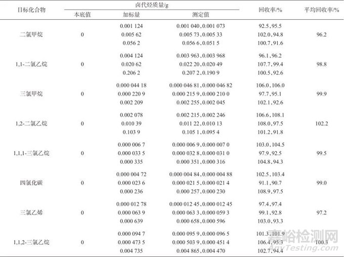 當稱樣量為2 g時,二氯甲烷、1,1-二氯乙烷、1,2-二氯乙烷、三氯甲烷、1,1,1-三氯乙烷、1,1,2-三氯乙烷、三氯乙烯、四氯化碳的檢出限分別為2.5、5、2.5、0.05、0.025、0.5、0.1、0.01 mg/kg。